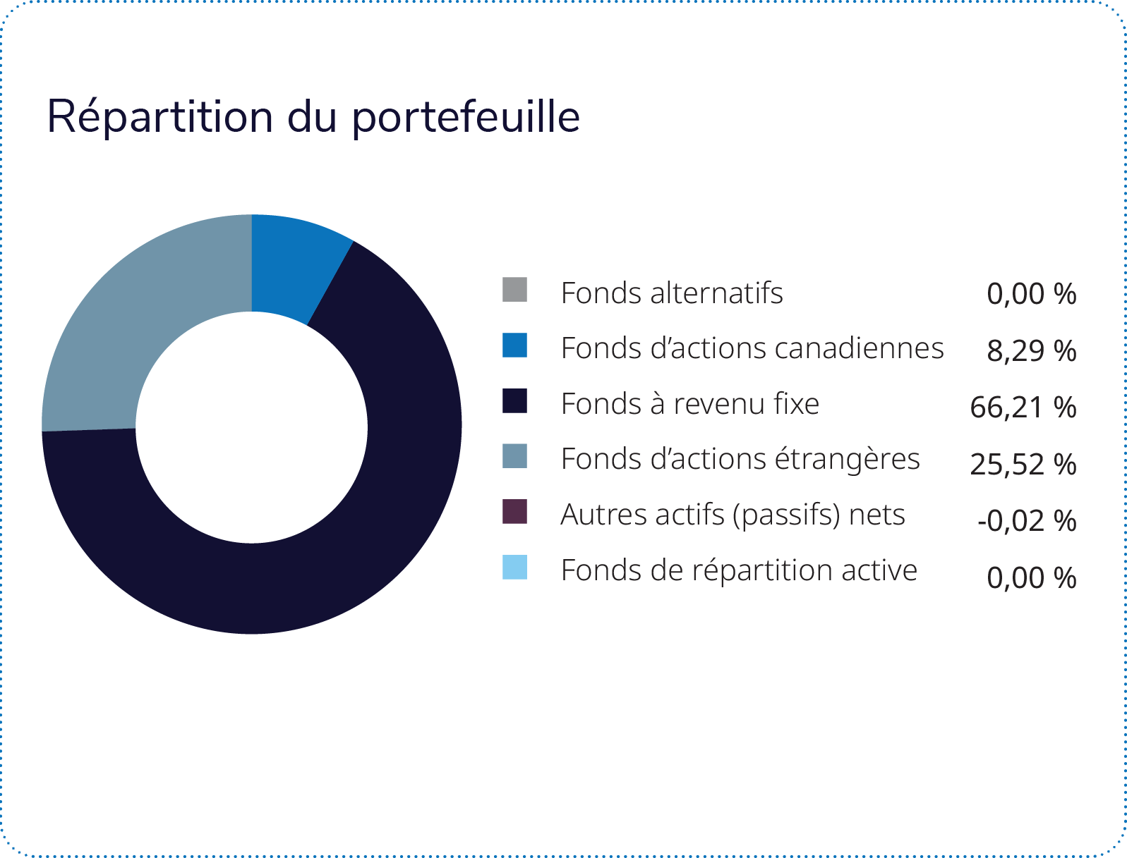 La répartition de l’actif du portefeuille a été favorable durant le trimestre, grâce à la surpondération des actions et à la sous-pondération des titres à revenu fixe. Du côté des actions, la rotation des pays est l’un des facteurs qui a grandement contribué au rendement. La surpondération de Taïwan et des États-Unis a été avantageuse au cours du trimestre, contrairement à la surpondération de la Suède et de l’Espagne, qui a été défavorable en raison de la croissance plus lente en Europe durant la période. Le positionnement sectoriel actif au niveau des actions américaines a légèrement contribué au rendement au cours du trimestre. En ce qui concerne les secteurs américains, la sous-pondération de la finance et de l’industrie a nui au rendement, tandis que la surpondération des services aux collectivités et de la consommation discrétionnaire lui a été favorable.