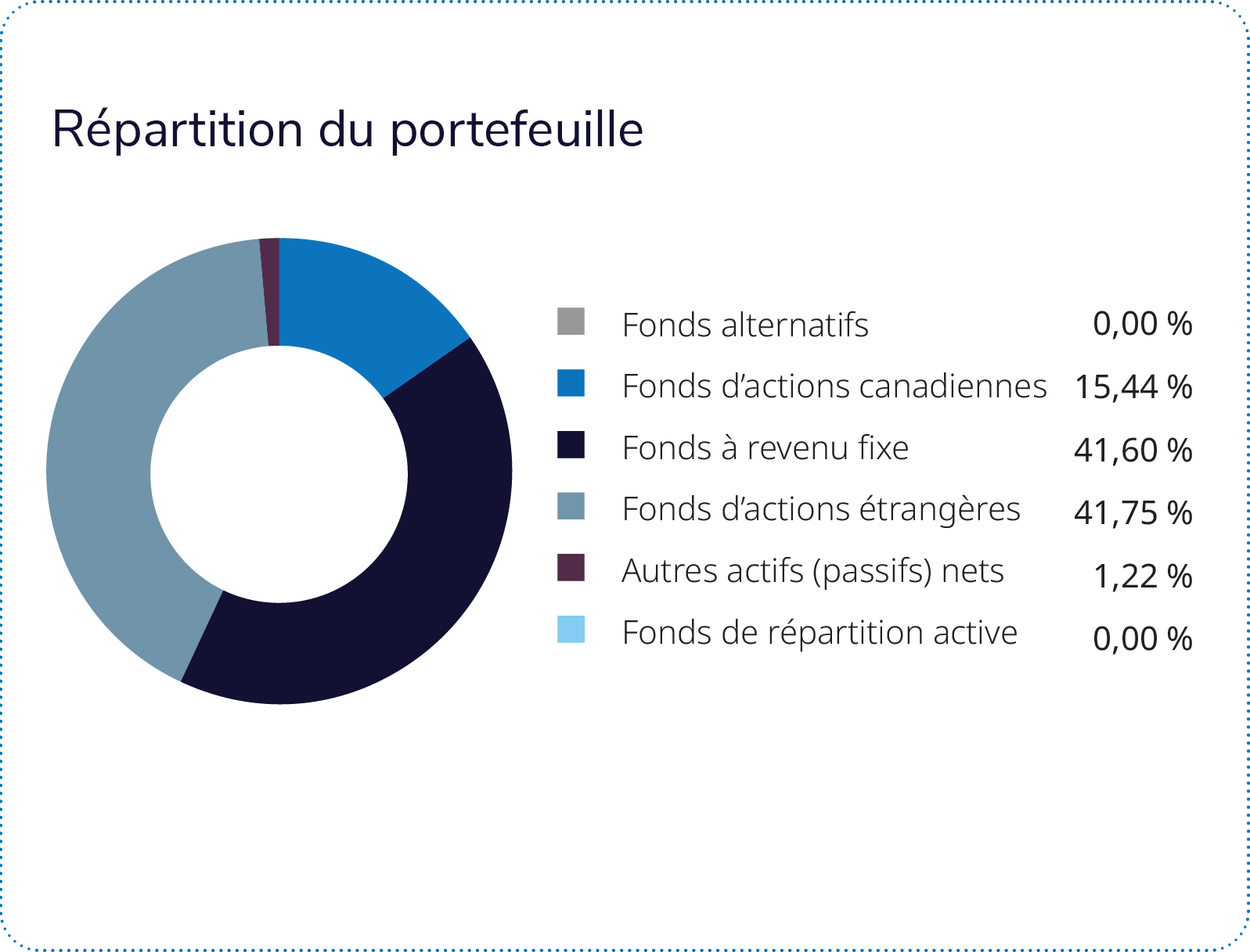 La répartition de l’actif du portefeuille a été favorable durant le trimestre, grâce à la surpondération des actions et à la sous-pondération des titres à revenu fixe. Du côté des actions, la rotation des pays est l’un des facteurs qui a grandement contribué au rendement. La surpondération de Taïwan et des États-Unis a été avantageuse au cours du trimestre, contrairement à la surpondération de la Suède et de l’Espagne, qui a été défavorable en raison de la croissance plus lente en Europe durant la période. En ce qui concerne les secteurs américains, la sous-pondération de la finance a nui au rendement, tandis que la surpondération de la consommation discrétionnaire lui a été favorable.